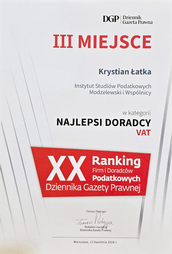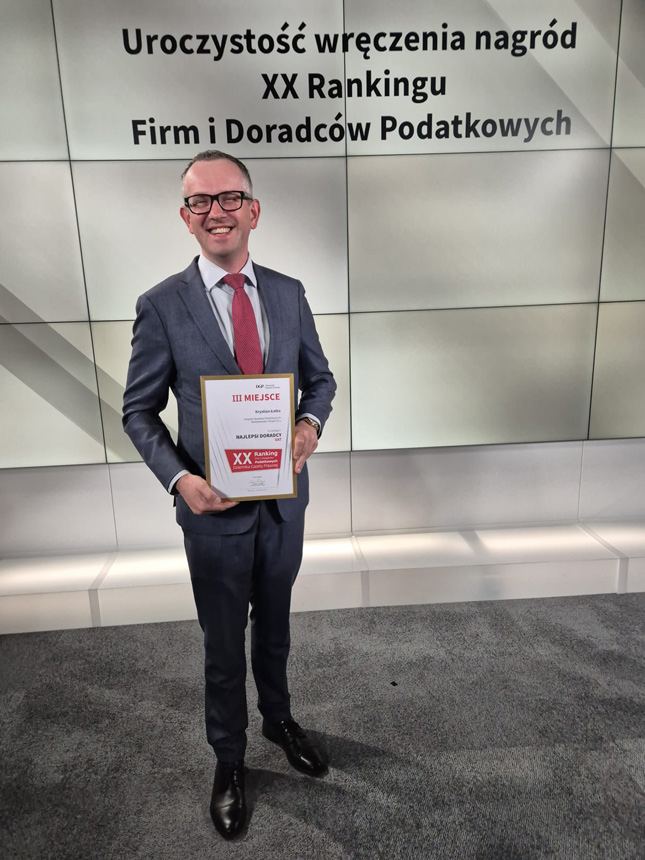 Tym bardziej jest mi miło poinformować, że w prestiżowej kategorii indywidualnej „Najlepsi doradcy podatkowi w 2025 r.” w zakresie VAT indywidualne wyróżnienie zdobył Krystian Łatka, zajmując zaszczytne III miejsce.