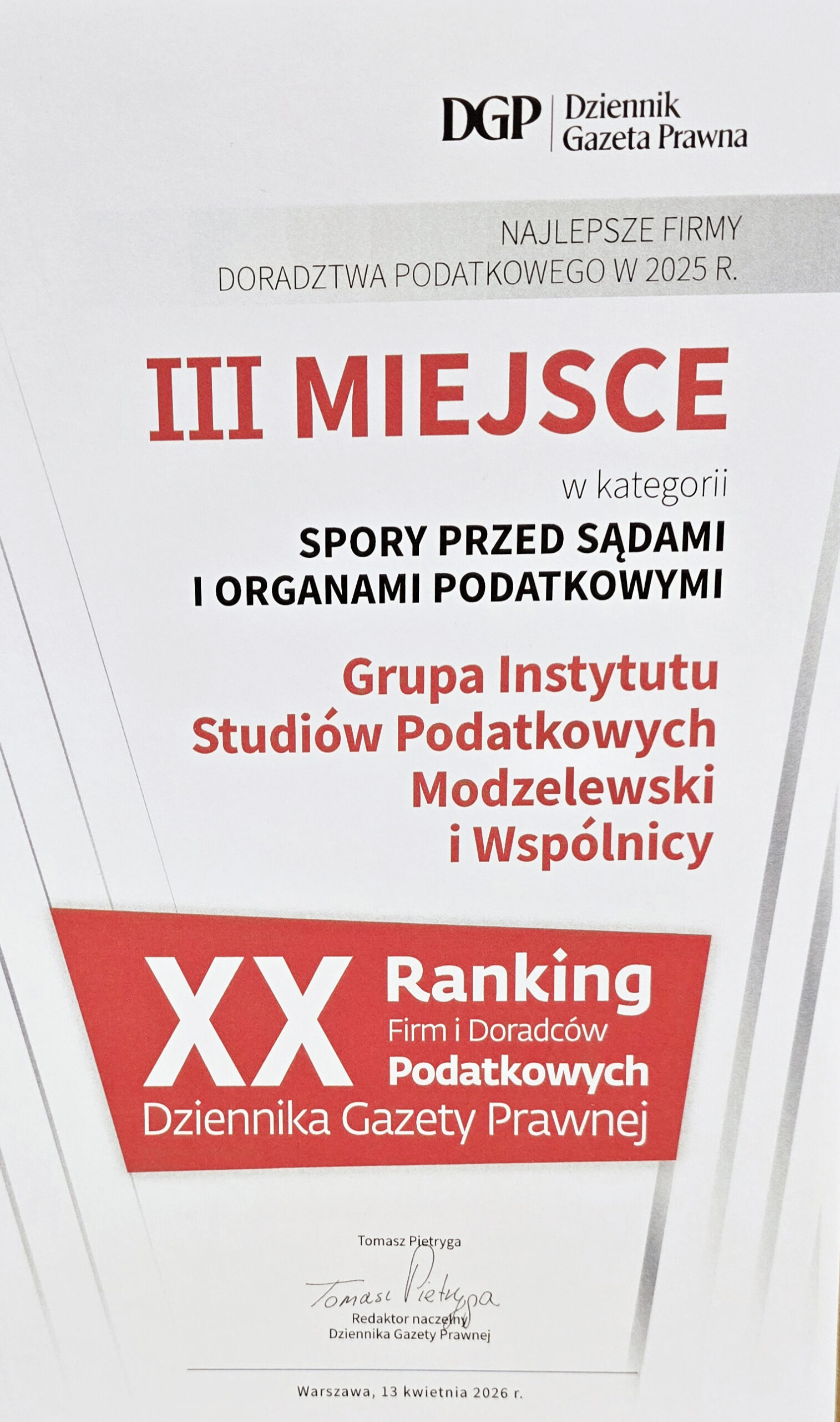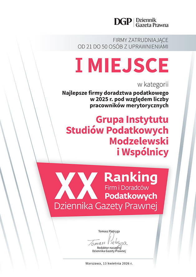 Tym bardziej jest mi miło poinformować, że - tak jak w poprzednich edycjach rankingu - udało nam się potwierdzić zaszczytną pozycję lidera doradztwa podatkowego: I miejsce w kategorii: Największe firmy doradztwa podatkowego w 2025 r. pod względem liczby pracowników merytorycznych - wśród firm zatrudniających 21-50 osób z uprawnieniami.